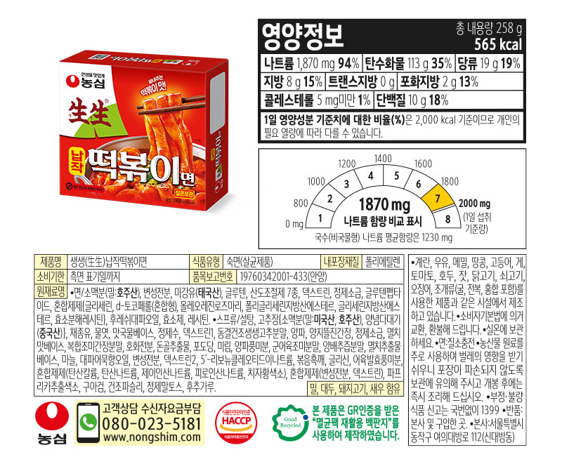 농심 생생납작떡볶이면 258g